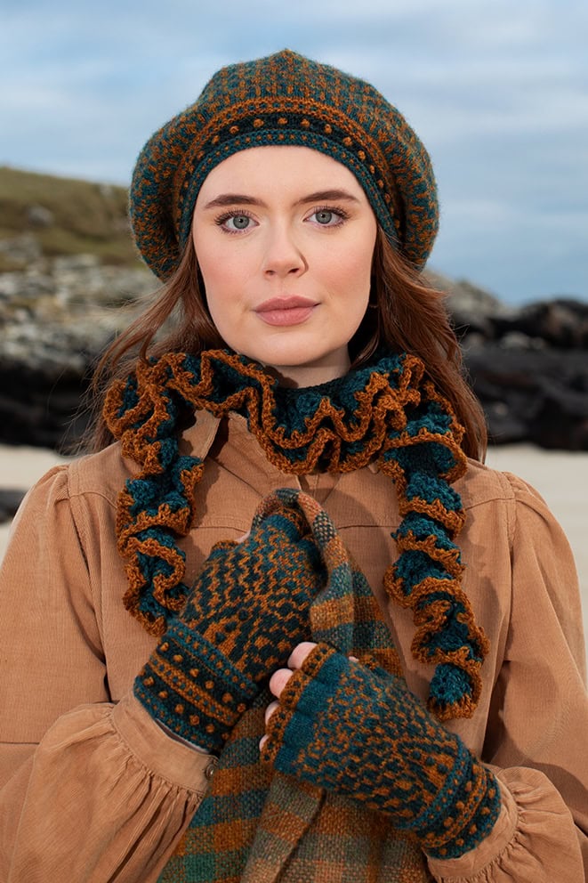 The Briodag Video Class Kit is composed of a scarf, a beret, and one pair of fingerless gloves, worked in three shades of Alice Starmore Hebridean 2 Ply – a lighter or brighter pattern colour and two darker background colours. Your background colours should tone well together and provide a good contrast for your pattern colour. It is shown here in four colourways, a warm colourway with a pattern colour of Corncrake and background of Erica and Red Deer; and a high contrast colourway with a pattern colour of Pebble Beach with background colours of Kelpie and Selkie. The Pebble Beach Briodag is also shown alongside a Persian Tiles Wrap and a Polaris cardigan. The third colourway is pale, with a pattern colour of Solan Goose and a background of Mountain Hare and Driftwood. This version is shown with a Peigi cardigan and matching Dun Cuffs from Creative Course 2. The fourth colourway is a pattern colour of Golden Plover and background colours of Calluna and Lapwing, that version is shown with an Oiseabhal woven wrap.
